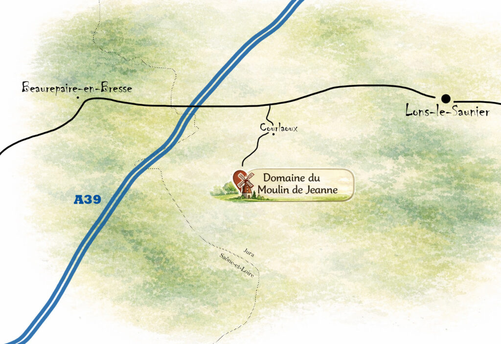 Des hôtels, gîtes, chambres d’hôtes et camping se trouvent à proximité en voiture. Le domaine est situé à 15min de Lons-le-Saunier, ville préfecture du Jura comportant de nombreux hôtels. Le village de Beaurepaire-en-Bresse, de l’autre côté de l’autoroute et de la « frontière » (Jura / Saône-et-Loire) se trouve à moins de 10 minutes en voiture.
